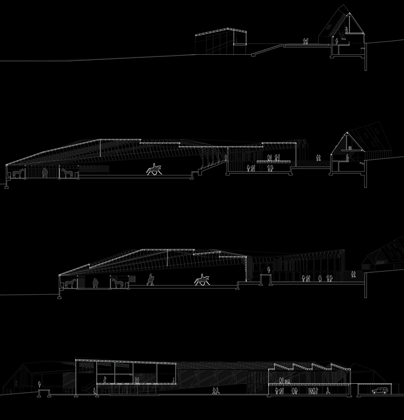 This project explores the tectonic relationship between the exhibition of bullfighting and the structure used to train for it. The project uses a coordinated series of long-span wooden trusses to bridge the horse training facilities and the owner's private gallery. The estate coordinates a private residence, a guest house, worker housing, horse stables, and an Olympic sized training rink through a single tectonic expression in wood framing.