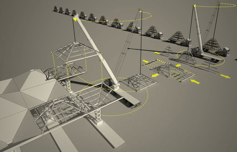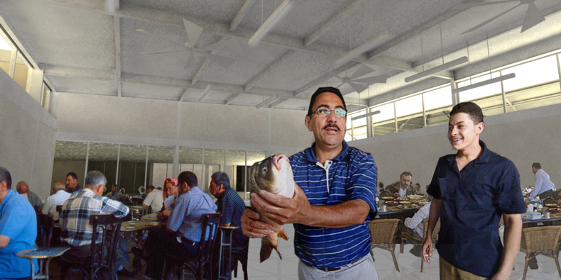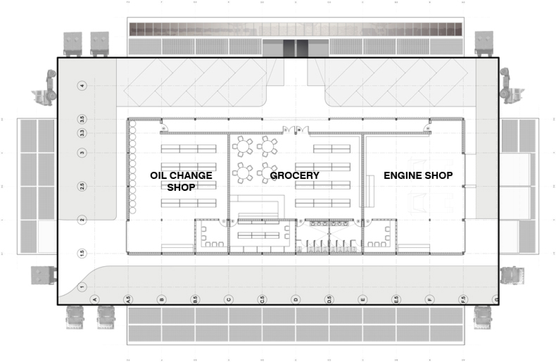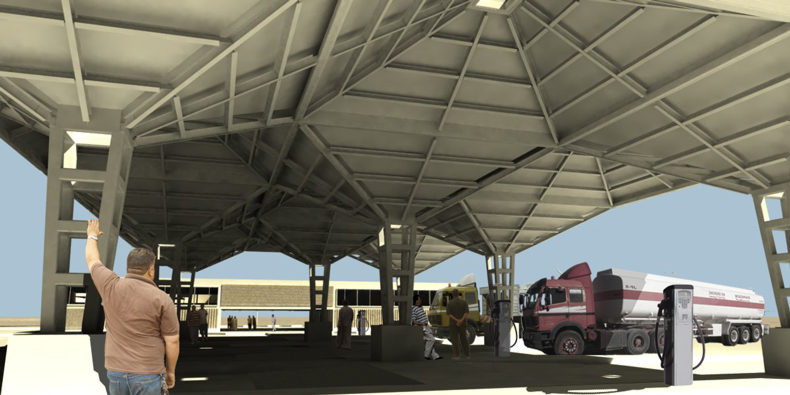 There is no simple way to describe the genesis of this project. Like many things in Iraq, even the most straightforward project becomes immensly complicated by cultural, political, and security considerations. Our involvement in Iraq began through a relatively brief commercial logistics planning study for the Iraqi Transportation Network. In our plan we developed a scalar system of architectural and infrastructural elements that could be deployed in various combinations in order to address the unique demands of Iraq's diverse national logistics needs. The Nassiriyah Truck Stop falls somewhere in the middle of this scale. The Nassiriyah Truck Stop is specifically geared towards facilitating microgrant businesses, the personal needs of Iraq's truck drivers, and establishing a landmark in an otherwise unpopulated stretch of highway. Allthough this project is relatively simple in its plan, it will have the capacity to house 6 fledgling trucking related local business, fuel up to 8 rigs at a time, and perhaps most importantly, provide delicious local Iraqi food for a hungry and busy trucking community.