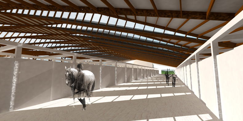 This project explores the tectonic relationship between the exhibition of bullfighting and the structure used to train for it. The project uses a coordinated series of long-span wooden trusses to bridge the horse training facilities and the owner's private gallery. The estate coordinates a private residence, a guest house, worker housing, horse stables, and an Olympic sized training rink through a single tectonic expression in wood framing.