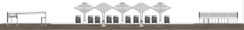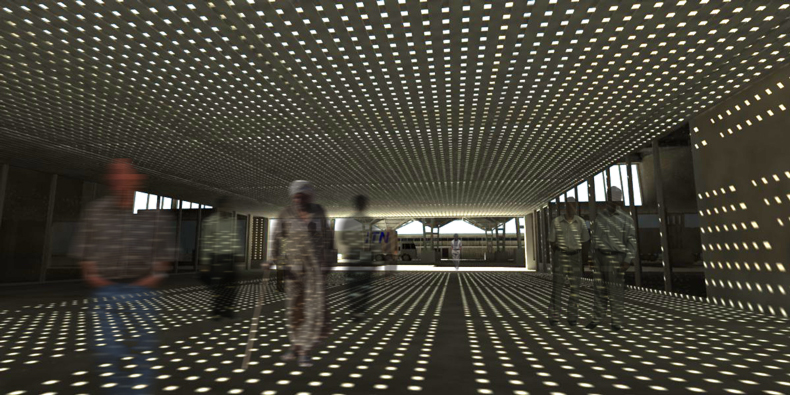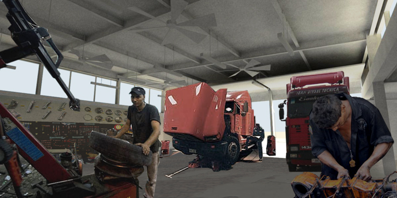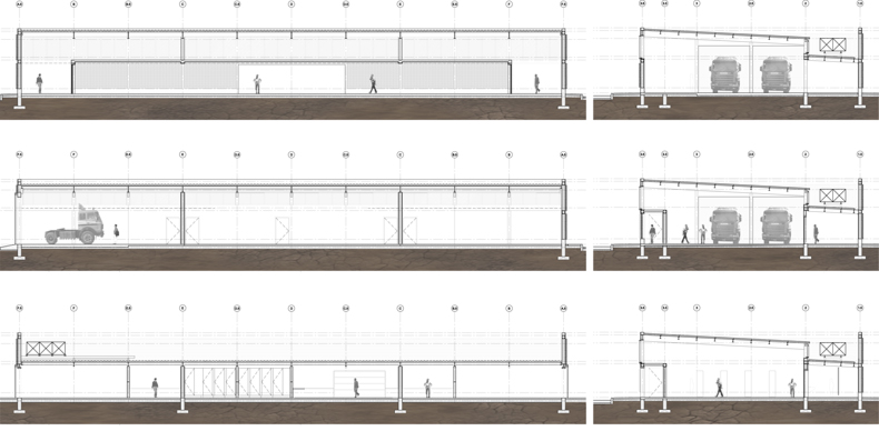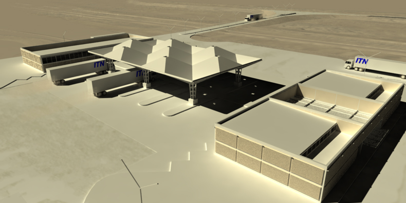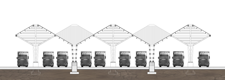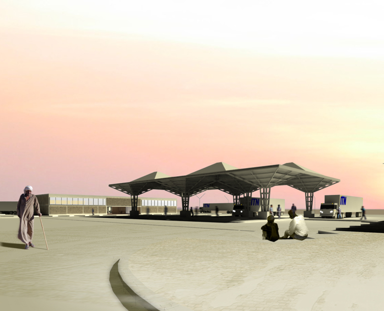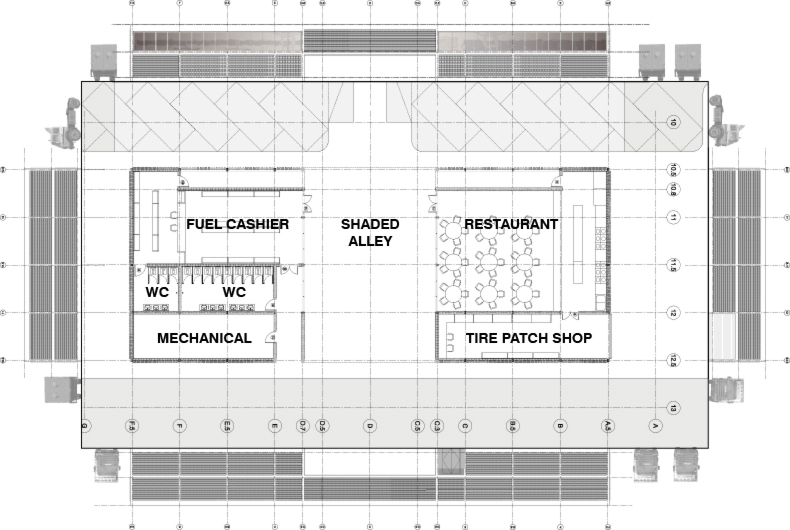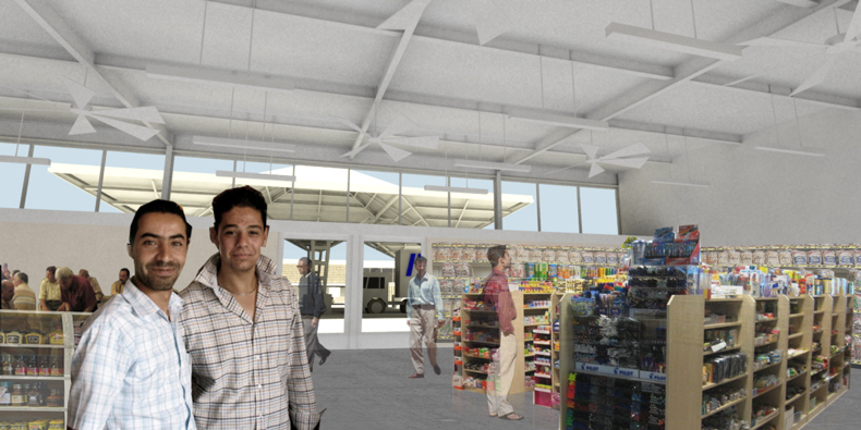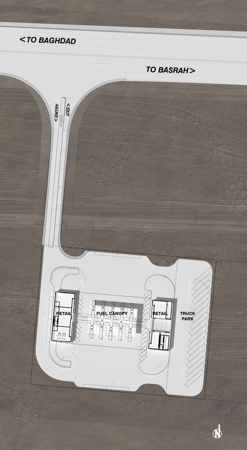There is no simple way to describe the genesis of this project. Like many things in Iraq, even the most straightforward project becomes immensly complicated by cultural, political, and security considerations. Our involvement in Iraq began through a relatively brief commercial logistics planning study for the Iraqi Transportation Network. In our plan we developed a scalar system of architectural and infrastructural elements that could be deployed in various combinations in order to address the unique demands of Iraq's diverse national logistics needs. The Nassiriyah Truck Stop falls somewhere in the middle of this scale. The Nassiriyah Truck Stop is specifically geared towards facilitating microgrant businesses, the personal needs of Iraq's truck drivers, and establishing a landmark in an otherwise unpopulated stretch of highway. Allthough this project is relatively simple in its plan, it will have the capacity to house 6 fledgling trucking related local business, fuel up to 8 rigs at a time, and perhaps most importantly, provide delicious local Iraqi food for a hungry and busy trucking community.